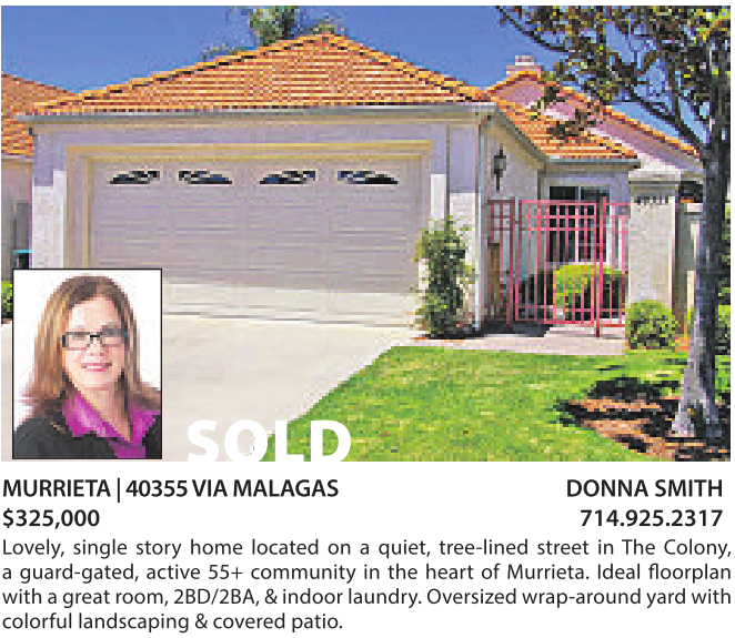 SOLD MURRIETA |40355 VIA MALAGAS DONNA SMITH $325,000 714.925.2317 Lovely, single story home located on a quiet, tree-lined street in The Colony, a guard-gated, active 55+ community in the heart of Murrieta. Ideal floorplan with a great room, 2BD/2BA, & indoor laundry. Oversized wrap-around yard with colorful landscaping&covered patio.
