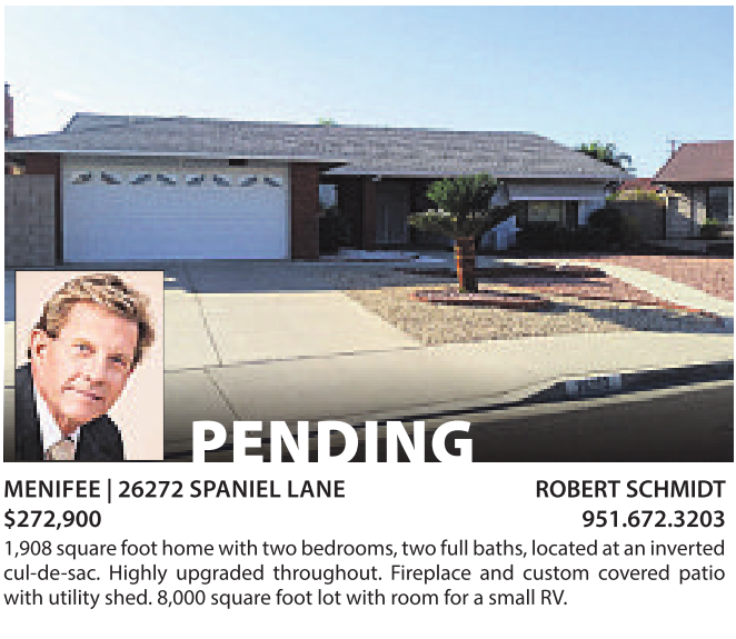 PENDING MENIFEE |26272 SPANIEL LANE $272,900 951.672.3203 1,908 squarefoothome with twobedrooms,two full baths,located at an inverted cul-de-sac. Highly upgraded throughout. Fireplace and custom covered patio with utilityshed. 8,000 squarefoot lot with room forasmallRV. ROBERT SCHMIDT See also