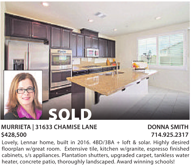 SOLD cabinets, s/s appliances. Plantation shutters, upgraded carpet, tankless water heater, concrete patio, thoroughly landscaped. Award winning schools! MURRIETA |31633 CHAMISE LANE DONNA SMITH $428,500 714.925.2317 Lovely, Lennar home, built in 2016. 4BD/3BA + loft & solar. Highly desired floorplan w/great room. Extensive tile, kitchen w/granite, espresso finished