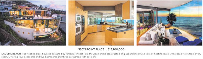LAGUNA BEACH: The floating glass house is designed by famed architect Paul McClean and is constructed of glass and steel with tiers of floating levels with ocean views from every room. Offering four bedrooms and five bathrooms and three-car garage with auto-lift.