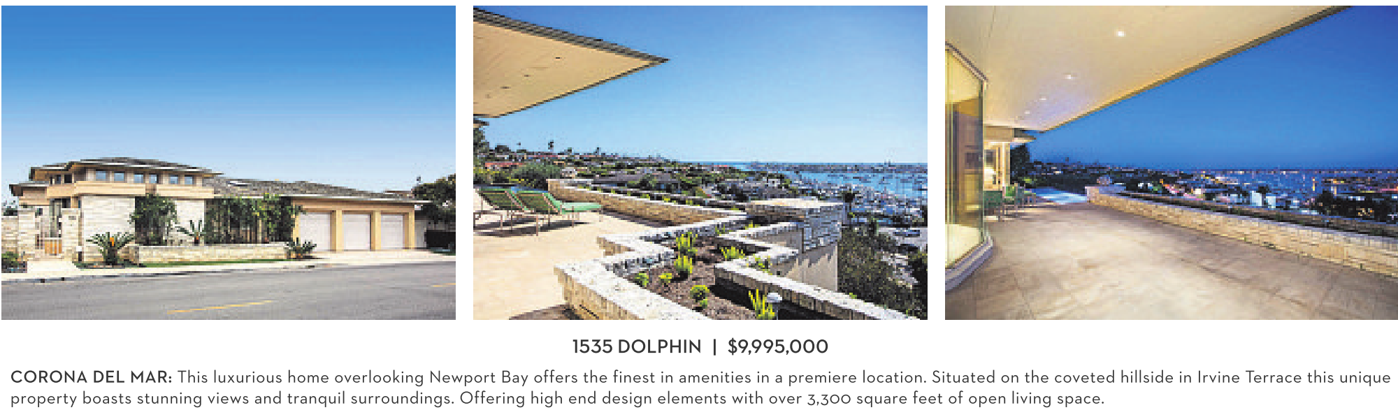 1535 DOLPHIN | $9,995,000 CORONA DEL MAR: This luxurious home overlooking Newport Bay offers the finest in amenities in a premiere location. Situated on the coveted hillside in Irvine Terrace this unique property boasts stunning views and tranquil surroundings. Offering high end design elements with over 3,300 square feet of open living space.
