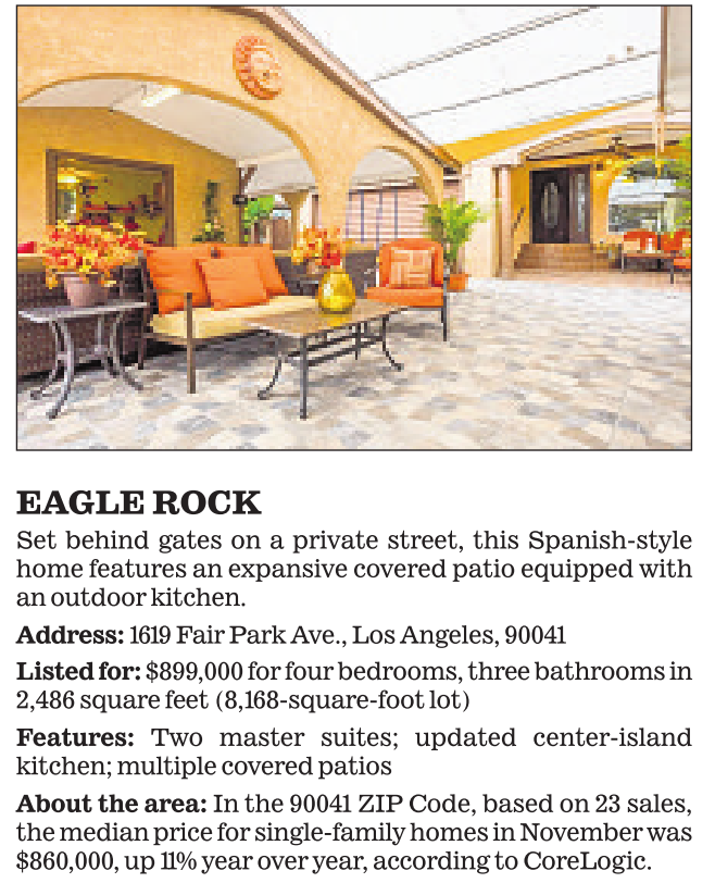 About the area: In the 90041 ZIP Code, based on 23 sales, the median price for single-family homes in November was $860,000, up 11% year over year, according to CoreLogic.