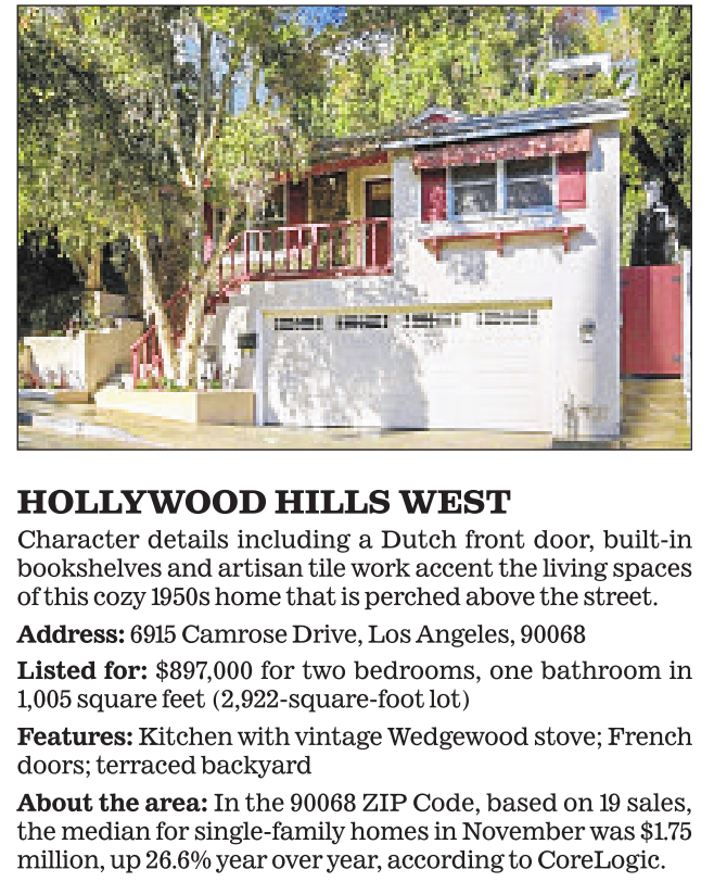 HOLLYWOOD HILLS WEST Character details including a Dutch front door, built-in bookshelves and artisan tile work accent the living spaces of this cozy1950s home that is perched above the street. Address: 6915 Camrose Drive, Los Angeles, 90068 Listed for: $897,000 for two bedrooms, one bathroom in 1,005 square feet (2,922-square-foot lot) Features: Kitchen with vintage Wedgewood stove; French doors; terraced backyard About the area: In the 90068 ZIP Code, based on 19 sales, the median for single-family homes in November was $1.75 million, up 26.6% year over year, according to CoreLogic. See also