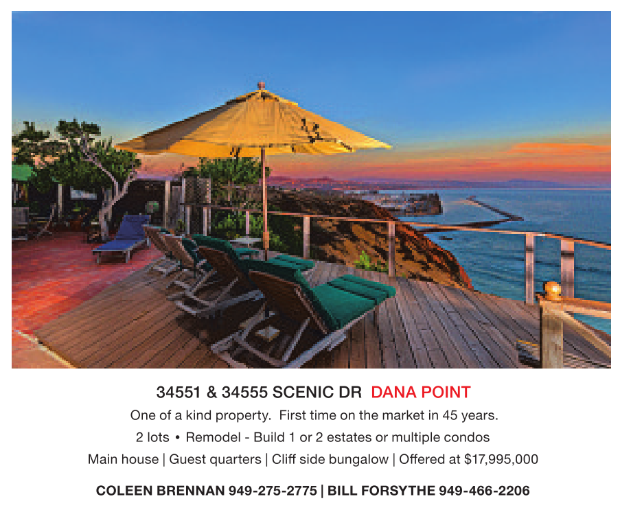 34551 & 34555 SCENIC DR DANA POINT One ofakind property. First time onthe market in 45 years. 2lots • Remodel -Build 1or2estates ormultiple condos Main house |Guest quarters |Cliff side bungalow |Offered at $17,995,000 COLEEN BRENNAN 949-275-2775 |BILL FORSYTHE 949-466-2206