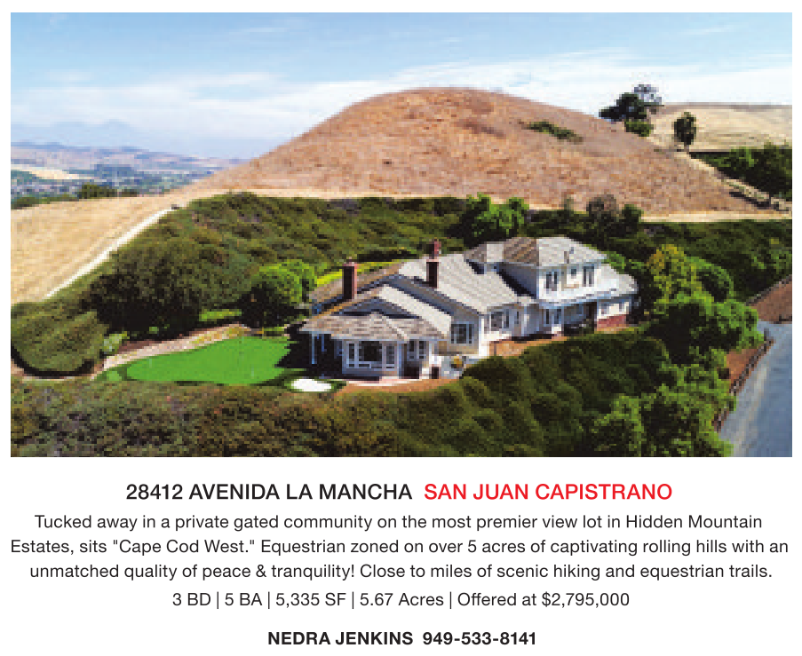28412 AVENIDA LA MANCHA SAN JUAN CAPISTRANO Tucked away in aprivate gated community on the most premier view lot in Hidden Mountain Estates, sits "Cape Cod West." Equestrian zoned on over 5acres ofcaptivating rolling hills with an unmatched quality ofpeace &tranquility! Close tomiles of scenic hiking and equestrian trails. 3BD|5BA|5,335 SF |5.67 Acres |Offered at $2,795,000 NEDRA JENKINS 949-533-8141