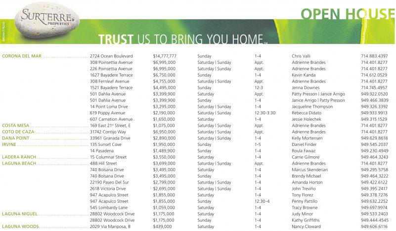 CORONA DEL MAR ...................................... 2724 Ocean Boulevard $14,777,777 Sunday 1-4 Chris Valli 714.883.4397 308 Poinsettia Avenue $6,995,000 Saturday | Sunday Appt. Adrienne Brandes 714.401.8277 226 Poinsettia Avenue $6,995,000 Saturday | Sunday Appt. Adrienne Brandes 714.401.8277 1627 Bayadere Terrace $6,750,000 Sunday 1-4 Kevin Kanda 714.612.0529 308 Fernleaf Avenue $4,755,000 Saturday | Sunday Appt. Adrienne Brandes 714.401.8277 1521 Bayadere Terrace $4,495,000 Sunday 12-3 Jenna Downes 714.745.4957 501 Dahlia Avenue $3,399,900 Saturday Appt. Patty Presson | Janice Arrigo 949.922.0520 501 Dahlia Avenue $3,399,900 Sunday 1-4 Janice Arrigo | Patty Presson 949.466.3839 14 Point Loma Drive $3,295,000 Saturday | Sunday 1-4 Jacqueline Thompson 949.326.3392 619 Poppy Avenue $2,190,000 Saturday | Sunday 12:30-3:30 Rebecca Didato 949.933.9913 607 Carnation Avenue $1,650,000 Saturday 1-4 Jessie Holechek 949.315.1529 COSTA MESA ................................................ 169 East 21 st Street, E $1,075,000 Saturday | Sunday Appt. Adrienne Brandes 714.401.8277 COTO DE CAZA ............................................ 31742 Contijo Way $6,950,000 Saturday | Sunday Appt. Adrienne Brandes 714.401.8277 DANA POINT ................................................ 33961 Granada Drive $2,890,000 Saturday | Sunday 1-4 Kelly Mortensen 949.629.8618 IRVINE ........................................................... 135 Sunset Cove $1,950,000 Sunday 1-5 Daniel Finder 949.545.2037 14 Pasadena $1,489,900 Sunday 1-4 Roula Fawaz 949.230.4949 LADERA RANCH........................................... 15 Columnar Street $3,550,000 Saturday 1-4 Carrie Gilmore 949.464.3243 LAGUNA BEACH........................................... 488 Hill Street $3,699,000 Saturday | Sunday Appt. Adrienne Brandes 714.401.8277 740 Bolsana Drive $3,495,000 Saturday 1-4 Marcus Skenderian 949.295.5758 740 Bolsana Drive $3,495,000 Sunday 1-4 Brendy Michael 949.464.3222 22190 Paseo Del Sur $2,799,000 Saturday | Sunday 1-4 Amanda Horton 949.422.6122 2618 Victoria Drive $2,695,000 Saturday | Sunday 1-4 John Treviño 949.395.2417 947 Acapulco Street $1,855,000 Saturday 1-4 Tony Florez 949.378.7276 947 Acapulco Street $1,855,000 Sunday 12:30-4 Penny Pattillo 949.632.2252 545 Lombardy Lane $1,059,000 Saturday 1-4 Tracy Browne 949.697.9974 LAGUNA NIGUEL.......................................... 28802 Woodcock Drive $1,175,000 Saturday 1-4 Judy Minor 949.533.2403 28802 Woodcock Drive $1,175,000 Sunday 1-4 Kathy Griffiths 949.444.4545 LAGUNA WOODS......................................... 2029 Via Mariposa, B $439,000 Saturday 1-4 Nancy Cloward 949.606.6116