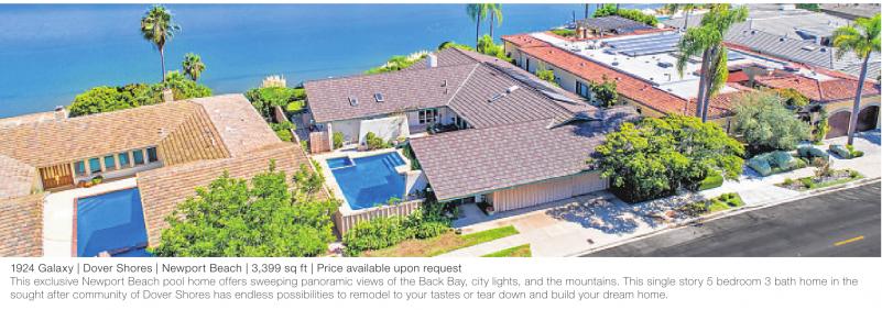 1924 Galaxy | Dover Shores | Newport Beach | 3,399 sq ft | Price available upon request This exclusive Newport Beach pool home offers sweeping panoramic views of the Back Bay, city lights, and the mountains. This single story 5 bedroom 3 bath home in the sought after community of Dover Shores has endless possibilities to remodel to your tastes or tear down and build your dream home.