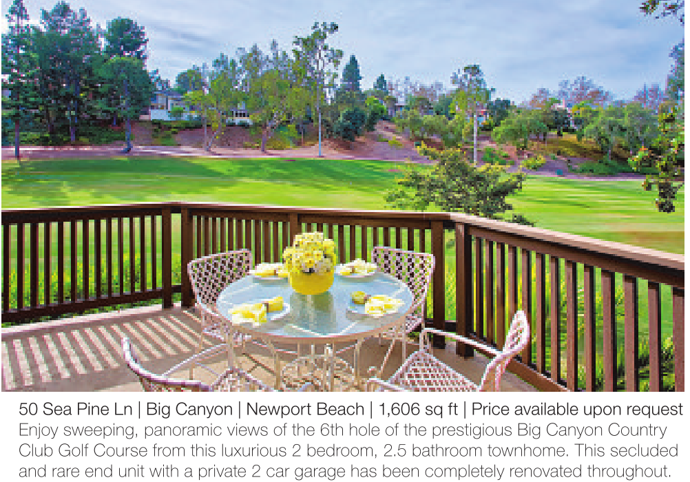 50 Sea Pine Ln | Big Canyon | Newport Beach | 1,606 sq ft | Price available upon request Enjoy sweeping, panoramic views of the 6th hole of the prestigious Big Canyon Country Club Golf Course from this luxurious 2 bedroom, 2.5 bathroom townhome. This secluded and rare end unit with a private 2 car garage has been completely renovated throughout.