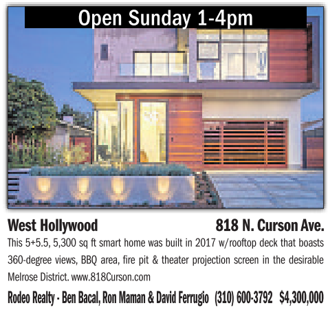 Open Sunday 1-4pm West Hollywood 818 N. Curson Ave. This 5+5.5, 5,300 sq ft smarthomewas built in 2017 w/rooftopdeckthat boasts 360-degree views, BBQ area, fire pit &theater projection screen inthe desirable Melrose District.www.818Curson.com Rodeo Realty -Ben Bacal, Ron Maman &David Ferrugio (310)600-3792 $4,300,000