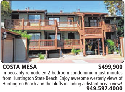 COSTA MESA $499,900 Impeccably remodeled 2-bedroom condominium just minutes from Huntington State Beach. Enjoy awesome westerly views of Huntington Beach and the bluffs including adistant ocean view!
