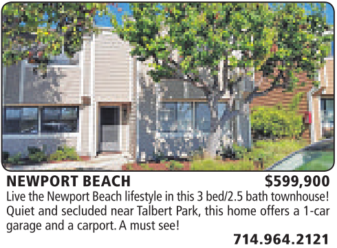 NEWPORT BEACH $599,900 Live the Newport Beach lifestyle in this 3bed/2.5 bath townhouse! Quiet and secluded near Talbert Park, this home offers a1-car garage and acarport. Amust see!
