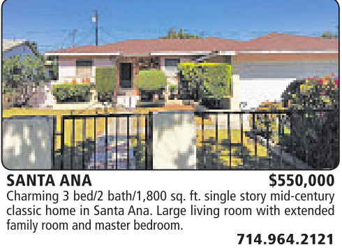 SANTA ANA $550,000 Charming 3bed/2 bath/1,800 sq. ft. single story mid-century classic home in Santa Ana. Large living room with extended family room and master bedroom.