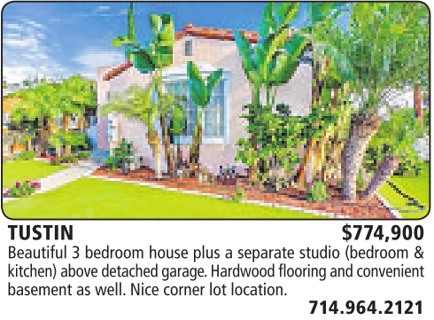 TUSTIN $774,900 Beautiful 3bedroom house plus aseparate studio (bedroom & kitchen) abovedetached garage. Hardwood flooring and convenient basement as well. Nice corner lot location.