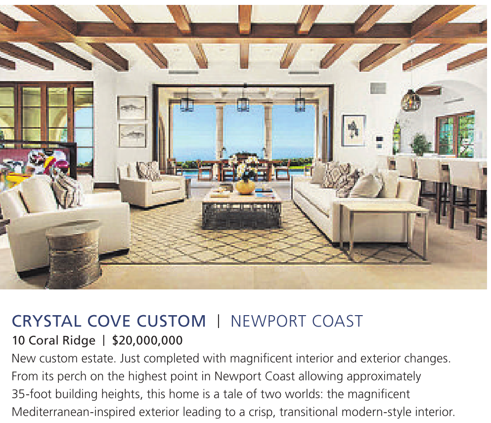 10 Coral Ridge | $20,000,000 New custom estate. Just completed with magnificent interior and exterior changes. From its perch on the highest point in Newport Coast allowing approximately 35-foot building heights, this home is a tale of two worlds: the magnificent Mediterranean-inspired exterior leading to a crisp, transitional modern-style interior.