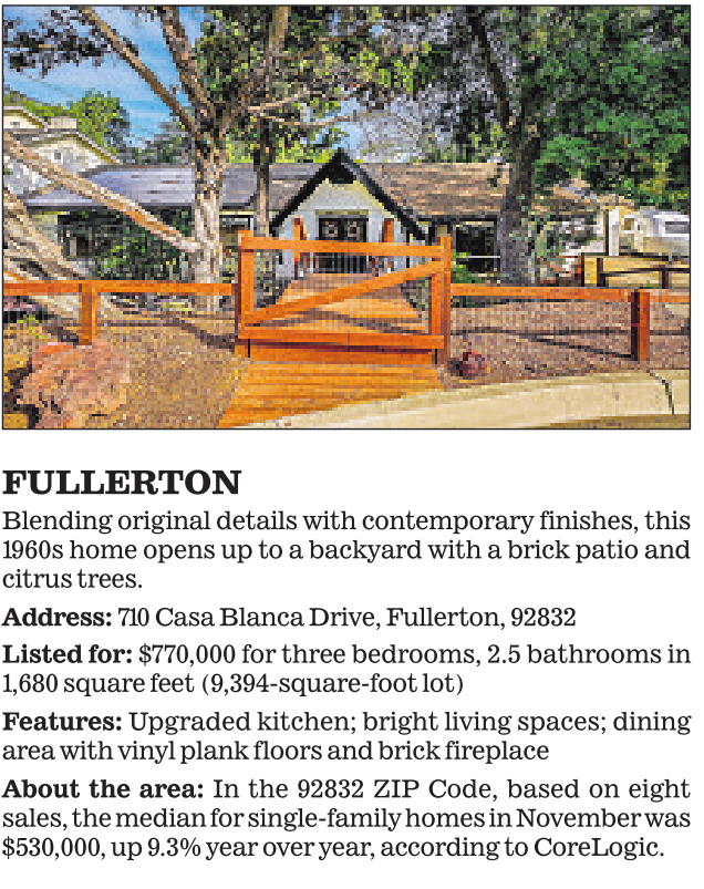 FULLERTON Blending original details with contemporary finishes, this 1960s home opens up to a backyard with a brick patio and citrus trees. Address: 710 Casa Blanca Drive, Fullerton, 92832 Listed for: $770,000 for three bedrooms, 2.5 bathrooms in 1,680 square feet (9,394-square-foot lot) Features: Upgraded kitchen; bright living spaces; dining area with vinyl plank floors and brick fireplace About the area: In the 92832 ZIP Code, based on eight sales, the median for single-family homes in November was $530,000, up 9.3% year over year, according to CoreLogic. See also