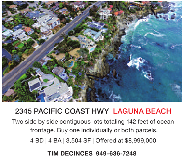 2345 PACIFIC COAST HWY LAGUNA BEACH Twoside byside contiguous lots totaling 142 feet of ocean frontage. Buy one individually or both parcels. 4BD|4BA |3,504 SF |Offered at $8,999,000