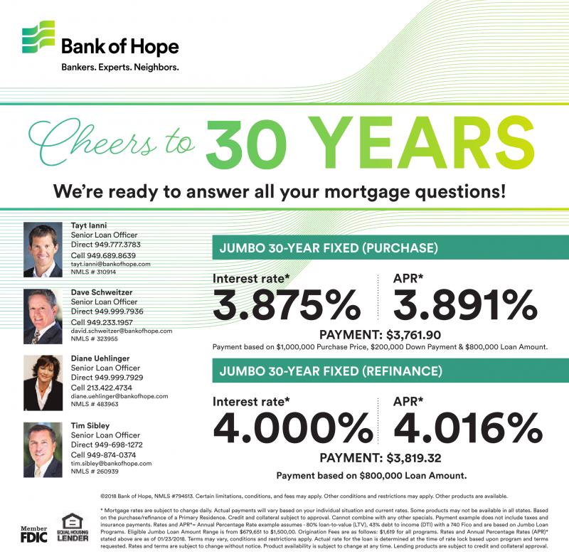 *Mortgage rates are subject to change daily. Actual payments will vary based on your individual situation and current rates. Some products may not be available in all states. Based on the purchase/refinance ofaPrimary Residence. Credit and collateral subject to approval. Cannot combine with any other specials. Payment example does not include taxes and insurance payments. Rates and APR*= Annual Percentage Rate example assumes -80% loan-to-value (LTV), 43% debt toincome (DTI) with a740 Fico and are based on Jumbo Loan Programs. Eligible Jumbo Loan Amount Range is from $679,651 to $1,500,00. Origination Fees are as follows: $1,619 for all programs. Rates and Annual Percentage Rates (APR)* stated above are as of 01/23/2018. Terms may vary, conditions and restrictions apply. Actual rate for the loan is determined at the time of rate lock based upon program and terms requested. Ratesand terms aresubject to change without notice. Productavailabilityissubject to change at any time.Lending products aresubject to credit and collateral approval.