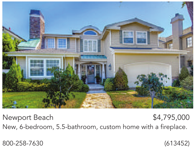 Newport Beach $4,795,000 New, 6-bedroom, 5.5-bathroom, custom home with a fireplace.