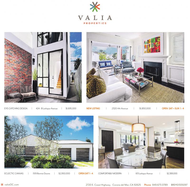 EYE-CATCHING DESIGN | 424 -BLarkspur Avenue | $1,695,000 NEW LISTING | 2320 4th Avenue | $1,850,000 | OPEN SAT+SUN 1-4 ECLECTIC CANVAS | 1519 Bonnie Doone | $2,950,000 | OPEN SAT1-4 COMFORTABLYMODERN | 613 Larkspur Avenue | $2,389,000 valiaOC.com 2720 E. Coast Highway, Corona del Mar, CA 92625 Phone 949.673.0789 BRE#01305097
