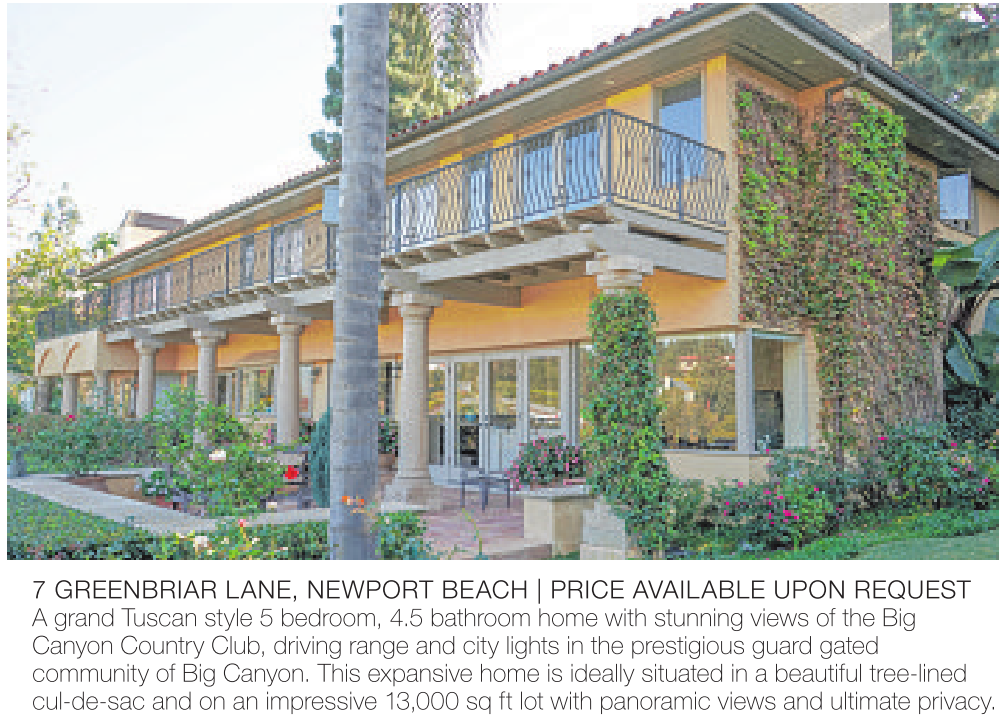 7 GREENBRIAR LANE, NEWPORT BEACH | PRICE AVAILABLE UPON REQUEST A grand Tuscan style 5 bedroom, 4.5 bathroom home with stunning views of the Big Canyon Country Club, driving range and city lights in the prestigious guard gated community of Big Canyon. This expansive home is ideally situated in a beautiful tree-lined cul-de-sac and on an impressive 13,000 sq ft lot with panoramic views and ultimate privacy.
