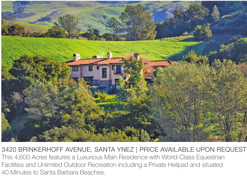 3420 BRINKERHOFF AVENUE, SANTA YNEZ | PRICE AVAILABLE UPON REQUEST This 4,600 Acres features a Luxurious Main Residence with World-Class Equestrian Facilities and Unlimited Outdoor Recreation including a Private Helipad and situated 40 Minutes to Santa Barbara Beaches.