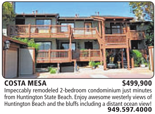 COSTA MESA $499,900 Impeccably remodeled 2-bedroom condominium just minutes from Huntington State Beach. Enjoy awesome westerly views of Huntington Beach and the bluffs including adistant oceanview!