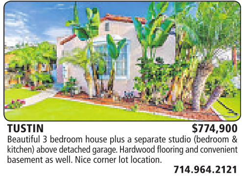 TUSTIN $774,900 Beautiful 3bedroom house plus aseparate studio (bedroom & kitchen) abovedetached garage. Hardwood flooring and convenient basement as well. Nice corner lot location.