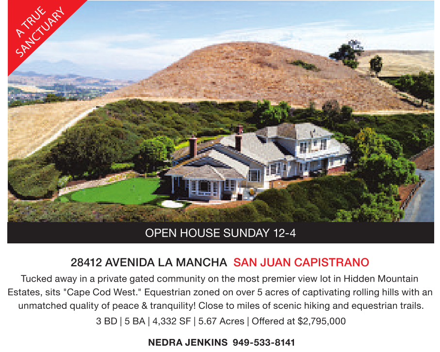 OPEN HOUSE SUNDAY 12-4 28412 AVENIDA LA MANCHA SAN JUAN CAPISTRANO Tucked away in aprivate gated community on the most premier view lot in Hidden Mountain Estates, sits "Cape Cod West." Equestrian zoned on over 5acres ofcaptivating rolling hills with an unmatched quality ofpeace &tranquility! Close tomiles of scenic hiking and equestrian trails. 3BD|5BA|4,332 SF |5.67 Acres |Offered at $2,795,000 NEDRA JENKINS 949-533-8141
