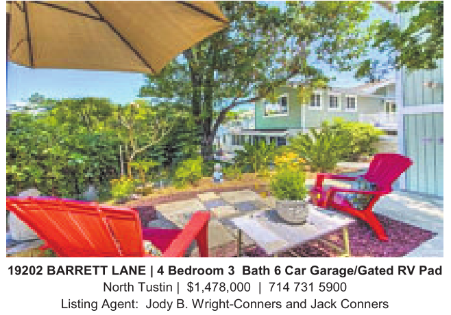 19202 BARRETT LANE |4Bedroom 3 Bath 6Car Garage/Gated RV Pad North Tustin | $1,478,000 | 714 731 5900 Listing Agent: Jody B.Wright-Conners and Jack Conners