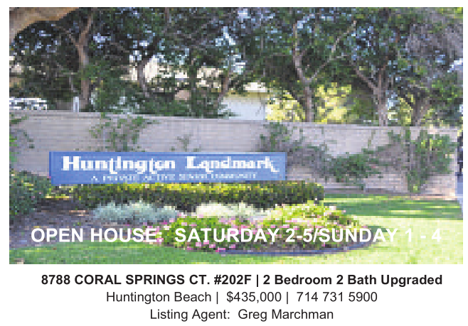 8788 CORAL SPRINGS CT. #202F |2Bedroom 2Bath Upgraded Huntington Beach | $435,000 | 714 731 5900 Listing Agent: Greg Marchman