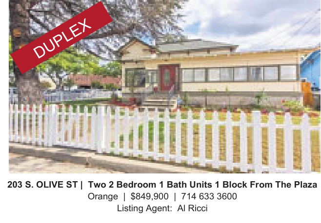203 S. OLIVE ST| Two 2Bedroom 1Bath Units 1Block From The Plaza Orange | $849,900 | 714 633 3600 Listing Agent: AlRicci