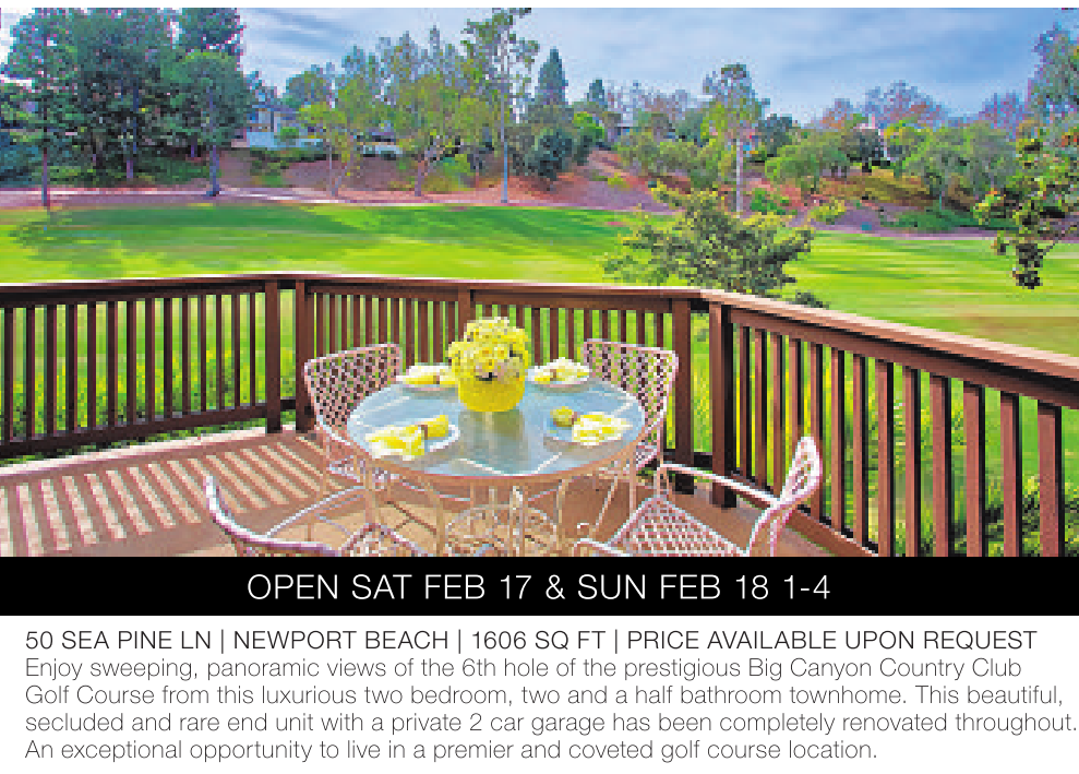 OPEN SAT FEB 17 & SUN FEB 18 1-4 50 SEA PINE LN | NEWPORT BEACH | 1606 SQ FT | PRICE AVAILABLE UPON REQUEST Enjoy sweeping, panoramic views of the 6th hole of the prestigious Big Canyon Country Club Golf Course from this luxurious two bedroom, two and a half bathroom townhome. This beautiful, secluded and rare end unit with a private 2 car garage has been completely renovated throughout. An exceptional opportunity to live in a premier and coveted golf course location. See also