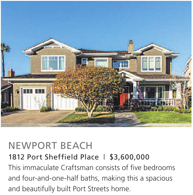 1812 Port Sheffield Place | $3,600,000 This immaculate Craftsman consists of five bedrooms and four-and-one-half baths, making this a spacious and beautifully built Port Streets home.