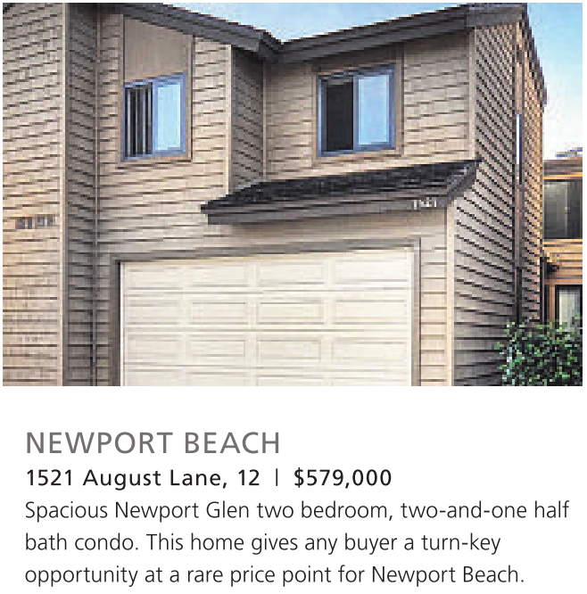 1521 August Lane, 12 | $579,000 Spacious Newport Glen two bedroom, two-and-one half bath condo. This home gives any buyer a turn-key opportunity at a rare price point for Newport Beach.