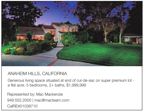 ANAHEIM HILLS, CALIFORNIA Generous living space situated at end of cul-de-sac on super premium lot - aflat acre. 5bedrooms, 2+ baths, $1,999,999