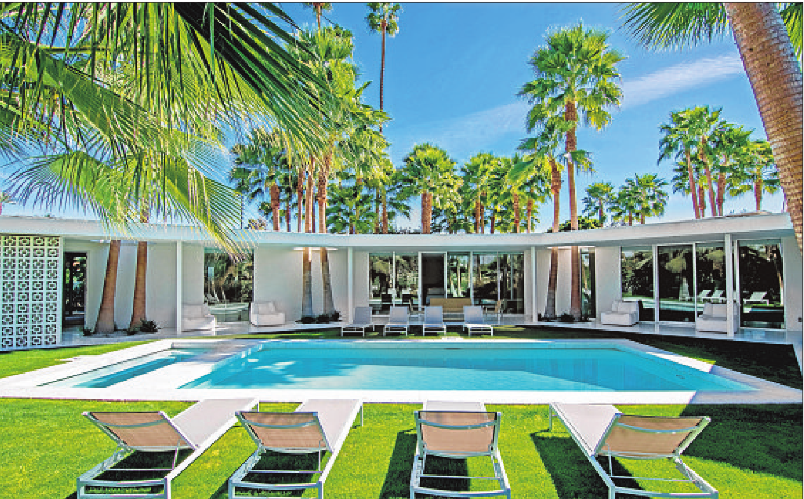 Outside, desert landscaping surrounds a slightly curved swimming pool. There’s also a twobedroom guest suite complete with a salon and wet bar.