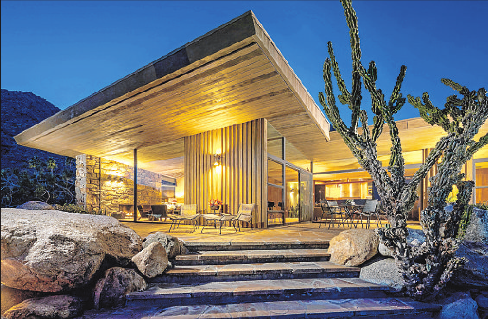 Designed by Ana Escalante, the flat-roofed house draws from midcentury-modern style, with block walls, clerestories and steel and wood beams. Walls of floor-toceiling windows take in mountain and city-light views.