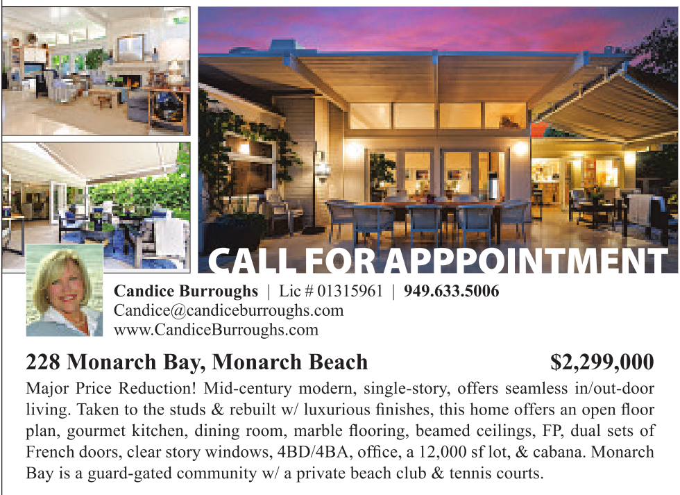 CALL FOR APPPOINTMENT Candice Burroughs | Lic #01315961 | 949.633.5006 Candice@candiceburroughs.com www.CandiceBurroughs.com 228 Monarch Bay, Monarch Beach $2,299,000 Major Price Reduction! Mid-century modern, single-story, offers seamless in/out-door living. Taken to the studs & rebuilt w/ luxurious finishes, this home offers an open floor plan, gourmet kitchen, dining room, marble flooring, beamed ceilings, FP, dual sets of French doors, clear story windows, 4BD/4BA, office, a 12,000 sf lot, & cabana. Monarch Bay is a guard-gated community w/ a private beach club & tennis courts.