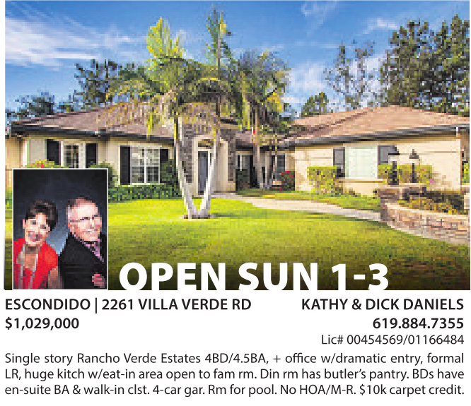 OPEN SUN 1-3 ESCONDIDO |2261 VILLA VERDE RD KATHY&DICK DANIELS $1,029,000 619.884.7355 Lic# 00454569/01166484 Single story Rancho Verde Estates 4BD/4.5BA, + office w/dramatic entry, formal LR, huge kitchw/eat-in area open to famrm. Din rm has butler’s pantry.BDs have en-suiteBA&walk-in clst. 4-car gar.Rmfor pool.NoHOA/M-R. $10k carpet credit. See also