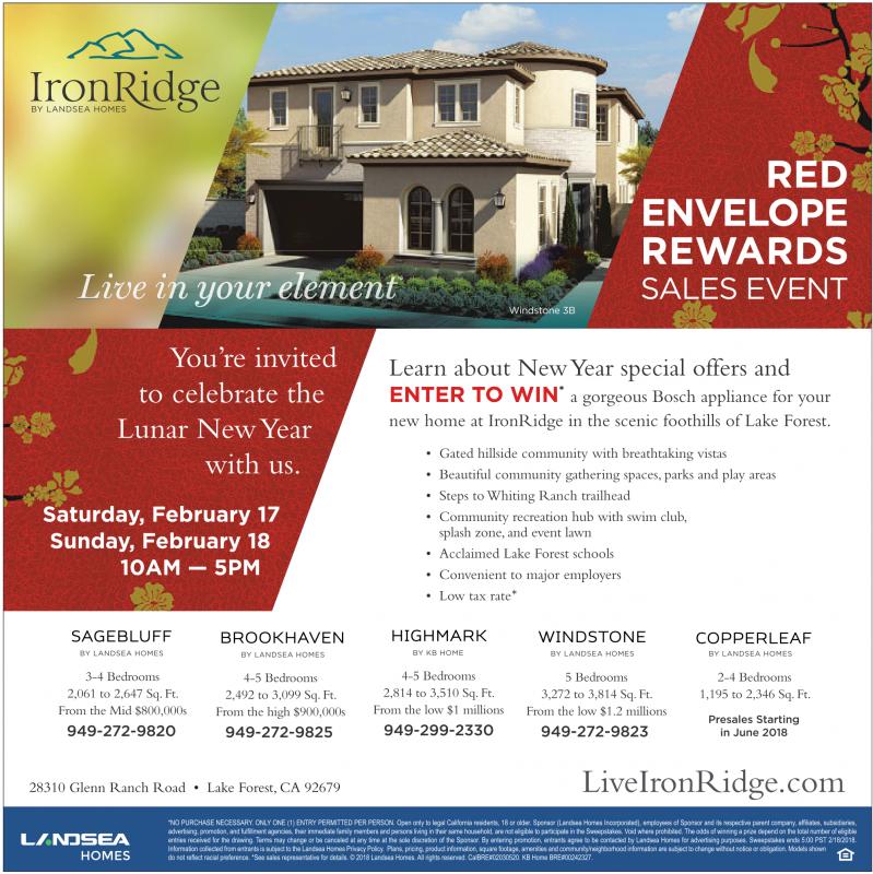 *NO PURCHASE NECESSARY. ONLYONE (1) ENTRYPERMITTED PER PERSON. Open only to legal California residents, 18 or older.Sponsor (Landsea Homes Incorporated), employees of Sponsor and its respective parent company,affiliates, subsidiaries, advertising, promotion, and fulfillment agencies, their immediate family members and persons living in their same household, are not eligible to participate in the Sweepstakes. Void where prohibited. The odds of winning aprize depend on the total number of eligible entries received for the drawing. Terms may change or be canceled at any time at the sole discretion of the Sponsor. Byentering promotion, entrants agree to be contacted by Landsea Homes for advertising purposes. Sweepstakes ends 5:00 PST 2/18/2018. Information collected from entrants is subject to the Landsea Homes Privacy Policy. Plans, pricing, product information, square footage, amenities and community/neighborhood information are subject to change without notice or obligation. Models shown do not reflect racial preference. *See sales representative for details. ©2018 Landsea Homes.All rights reserved. CalBRE#02030520. KB Home BRE#00242327.