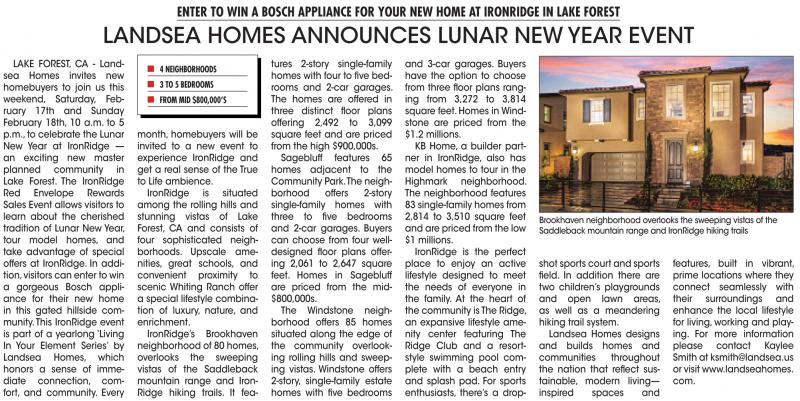 LAKE FOREST, CA - Landsea Homes invites new homebuyers to join us this weekend, Saturday, February 17th and Sunday February 18th, 10 a.m. to 5 p.m., to celebrate the Lunar New Year at IronRidge — an exciting new master planned community in Lake Forest. The IronRidge Red Envelope Rewards Sales Event allows visitors to learn about the cherished tradition of Lunar New Year, tour model homes, and take advantage of special offers at IronRidge. In addition,visitors can enter to win a gorgeous Bosch appliance for their new home in this gated hillside community.This IronRidge event is part of a yearlong ‘Living In Your Element Series’ by Landsea Homes, which honors a sense of immediate connection, comfort, and community. Every