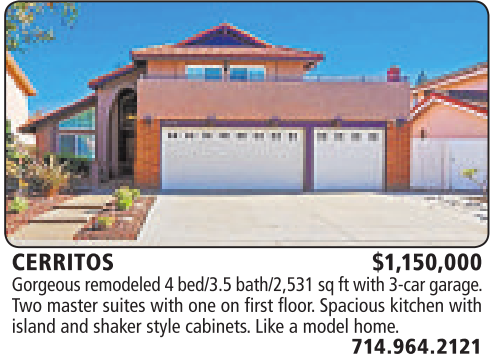 CERRITOS $1,150,000 Gorgeous remodeled 4bed/3.5 bath/2,531sqftwith 3-cargarage. Twomaster suites with one on first floor.Spacious kitchen with island and shaker style cabinets.Likeamodel home.
