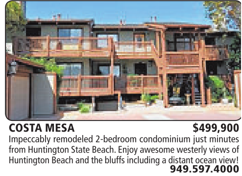 COSTA MESA $499,900 Impeccably remodeled 2-bedroom condominium just minutes from Huntington State Beach. Enjoy awesome westerly views of Huntington Beach and the bluffs including adistant ocean view!