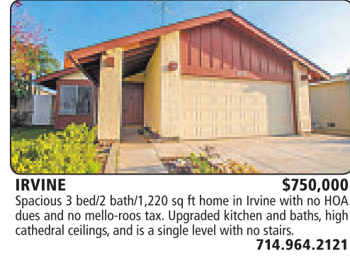 IRVINE $750,000 Spacious 3bed/2 bath/1,220 sq ft home in Irvine with no HOA dues and no mello-roos tax. Upgraded kitchen and baths,high cathedral ceilings,and is asingle levelwith no stairs.