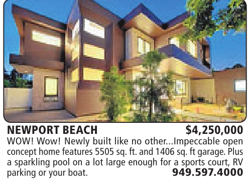 NEWPORT BEACH $4,250,000 WOW! Wow! Newly built like no other...Impeccable open concept homefeatures 5505 sq. ft. and 1406sq. ft garage.Plus a sparkling pool on a lot large enough for a sports court, RV parking or your boat. 949.597.4000