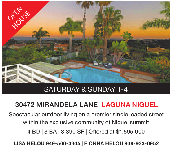 SATURDAY & SUNDAY 1-4 30472 MIRANDELA LANE LAGUNA NIGUEL Spectacular outdoor living on apremier single loaded street within the exclusive community ofNiguel summit. 4BD|3BA |3,390 SF |Offered at $1,595,000 LISA HELOU 949-566-3345 |FIONNA HELOU 949-933-6952