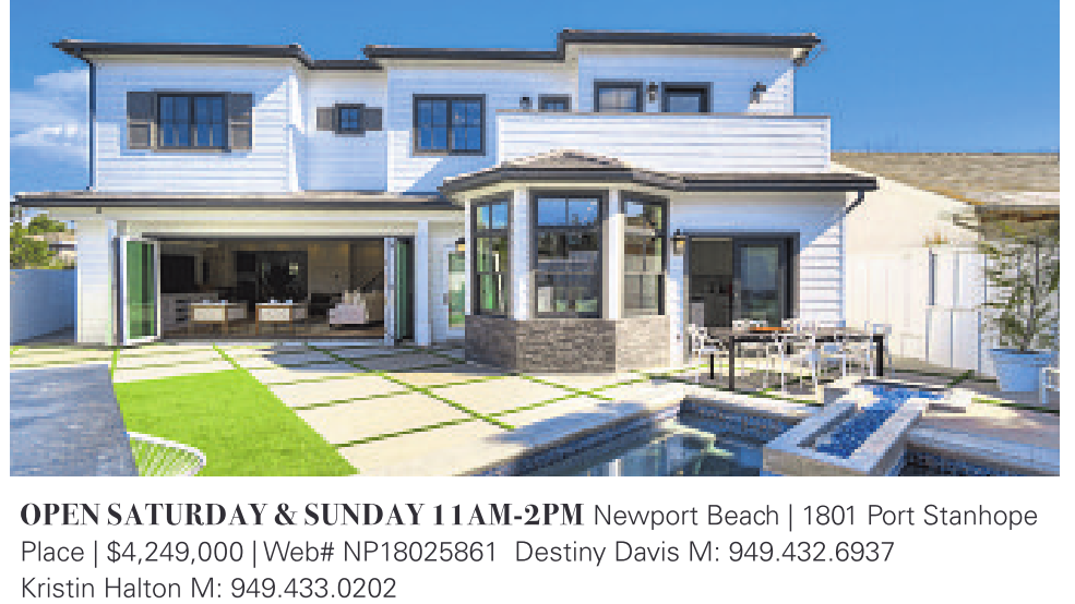 OPEN SATURDAY & SUNDAY 11AM-2PM Newport Beach | 1801 Port Stanhope Place | $4,249,000 |Web# NP18025861 Destiny Davis M: 949.432.6937 Kristin Halton M: 949.433.0202