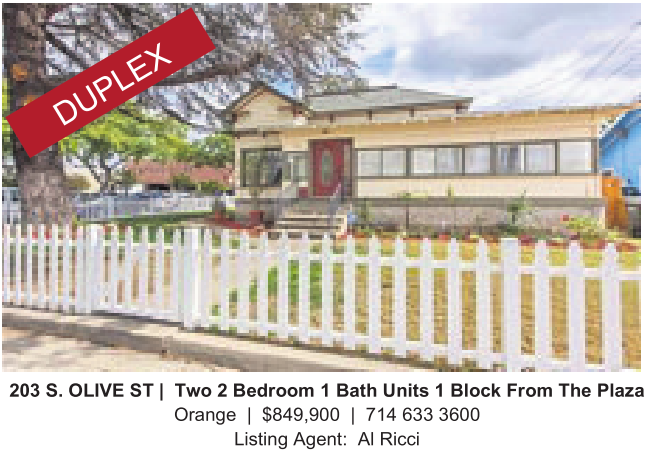 203 S.OLIVE ST | Two 2Bedroom 1Bath Units 1Block From The Plaza Orange | $849,900 | 714 633 3600 Listing Agent: AlRicci