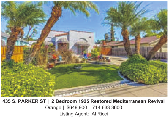 435 S. PARKER ST | 2 Bedroom 1925 Restored Mediterranean Revival Orange | $649,900 | 714 633 3600 Listing Agent: AlRicci