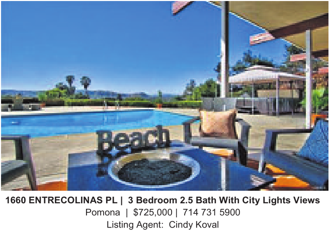 1660 ENTRECOLINAS PL| 3Bedroom 2.5 Bath With City Lights Views Pomona | $725,000 | 714 731 5900 Listing Agent: Cindy Koval